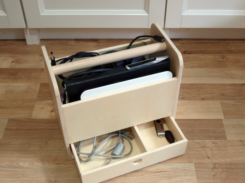 Damit ich die kleinen Gegenstände auch wiederfinde, habe ich den Kasten so konstruiert, dass unter der Kiste für die großen Teile eine kleine Schublade eingebaut ist, die in zwei Fächern Kabel und anderen Kleinkram aufnimmt.