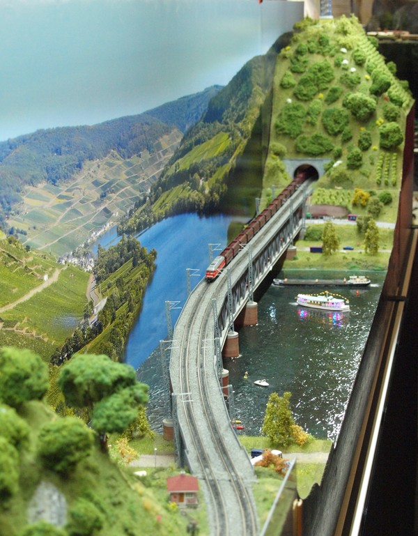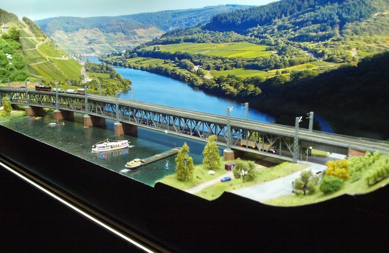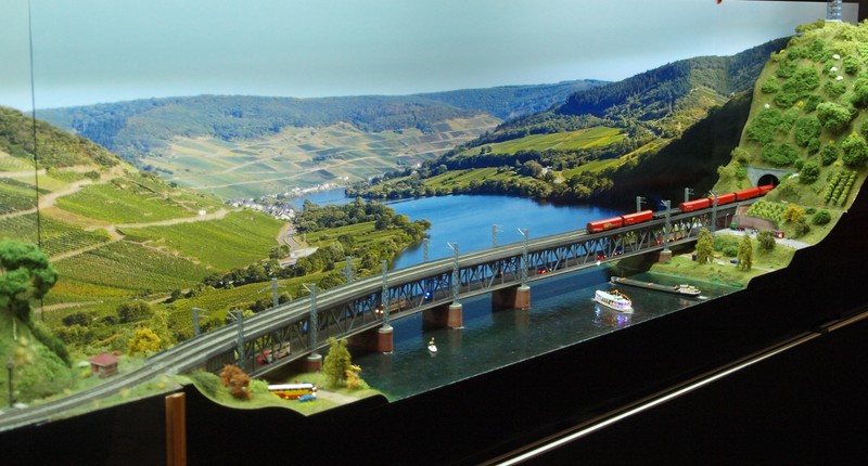 Wunderbar war die Anlage in der Baugröße Z, die die Doppelstrockbrücke in Bullay zum Vorbild hat. Dort bewegten sich Züge aus verschiedenen Epochen durch eine wunderschön gestaltete Landschaft.