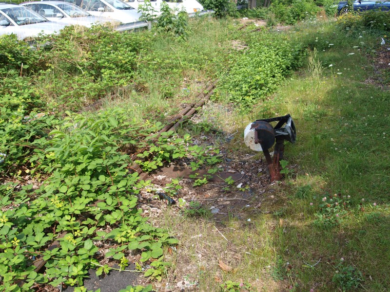 Im rechten, östlichen, Teil liegt die Weiche seit Jahren schon im dichten Gestrüpp. Auch auf dem alten Luftbild von Google habe ich nicht hundertprozentig erkennen können, ob die Lage der Weiche so genau richtig ist. Es kommt aber ganz gut hin, wenn man sich die noch bestehenden Gleis anschaut.