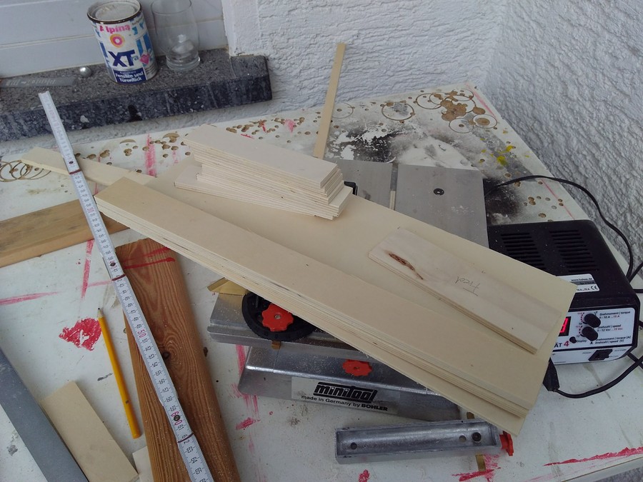 Mit der kleinen Tischkreissäge waren die Teile rasch zugeschnitten. Ich bin wirklich froh, dass die kalten Zeit jetzt erst einmal vorbei ist: Letzte Woche war es auf der Terasse ziemlich kalt, da hat das Sägen keinen Spaß gemacht.