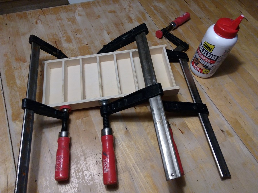Die zugeschnittenen Teile habe ich dann nach und nach verleimt. Damit die Fächer alle gleich breit werden, habe ich mir einen Abstandshalter zugesägt, den ich mit Backpapier umwickelt habe, damit er nicht festklebt.