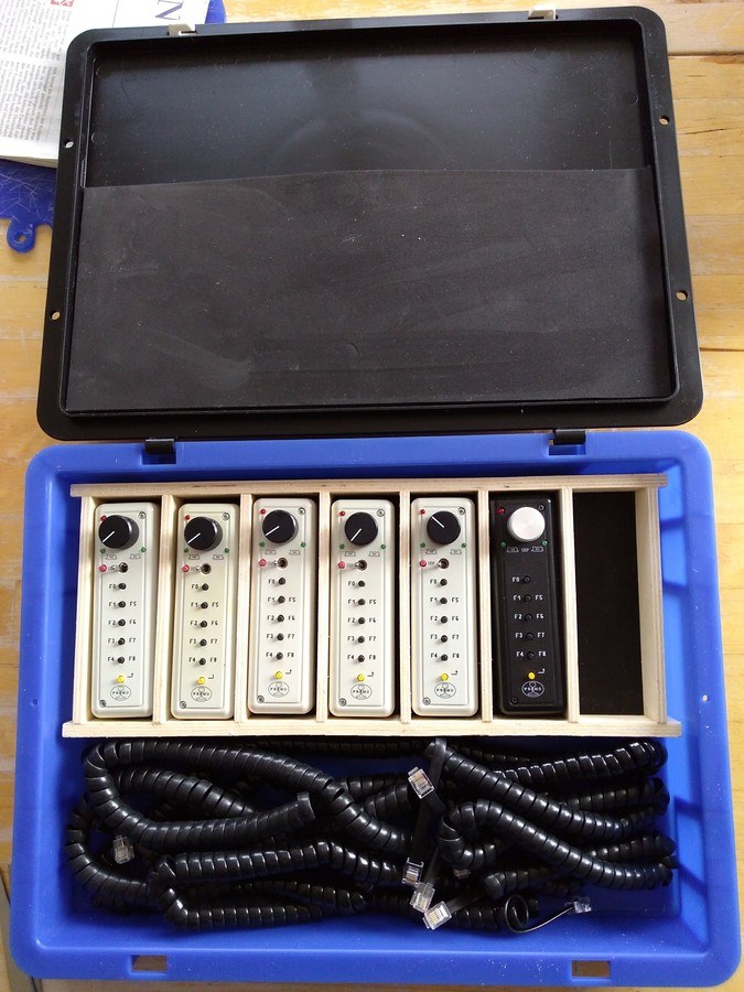 Ich hatte noch eine 50mm hohe Eurobox übrig, in die die Handregler problemlos hinheinpassen. Damit die Regler beim Transport nicht hin- und herrumpeln habe ich mit einen Holzeinsatz mit einzelnen Fächern überlegt, in denen die Handregler auf einer dünnen Lage Zellkautschuk gelagert werden. Auch der Deckel der Eurobox wird von innen mit Zellkautschuk beklebt.