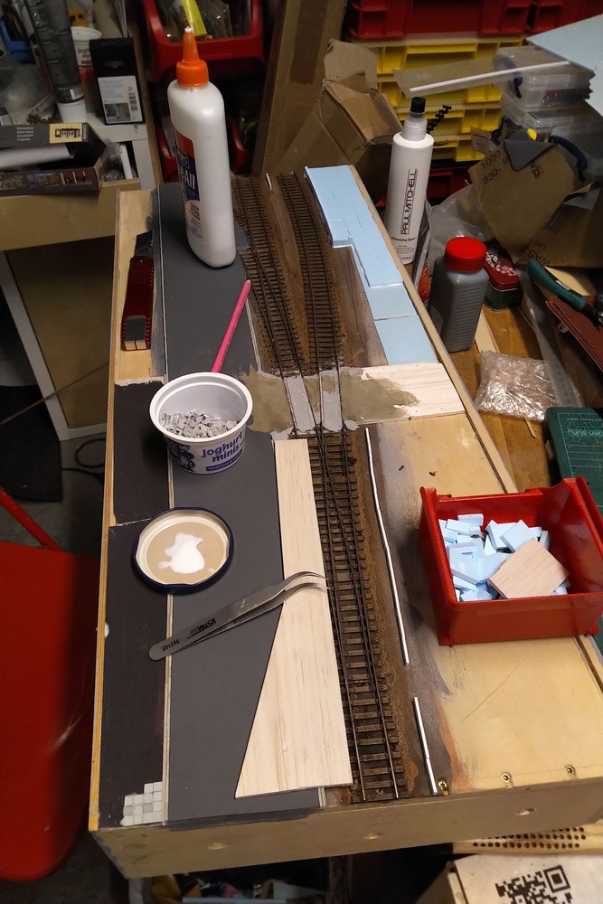 Inzwischen ist die Ladestraße fertig verlegt und bemalt. Der nächste Schritt ist jetzt die Alterung der Betonmauer und das Schottern der Gleise. Auch die Straße braucht noch etwas Zuwendung in Form eines Schliffs und der Darstellung von Reparaturen.