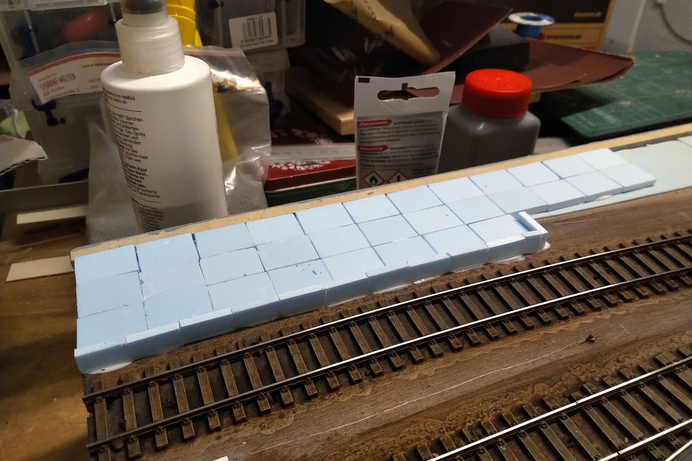 Die Mauer, die das Betriebsgelände des Schrotthandels vom Industriestammgleis trennt, besteht aus Balsaholz, auf das ich eine Spachtelmasse aus dem Militärmodellbau aufgetragen habe, die Beton darstellt.