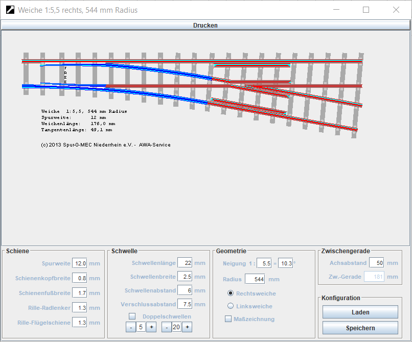 Der Spur-0-MEC Niederrhrein hat zusammen mit der ehemaligen Firma AWA Service vor Jahren ein Programm namens Weiche 1.1 entwickelt. Dabei handelt es sich um ein in Java geschriebenes Programm zum Erstellen von Weichenzeichnungen: