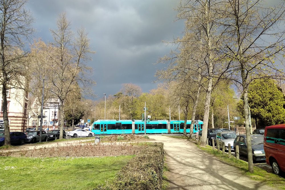 Gestern Nachmittag bot sich in der Günthersburgallee Richtung Norden dieser schöne Blick. Ich mag den Kontrast zwischen dem zarten Grün an den Bäumen und dem blaugrau der Wolken im Hintergrund.