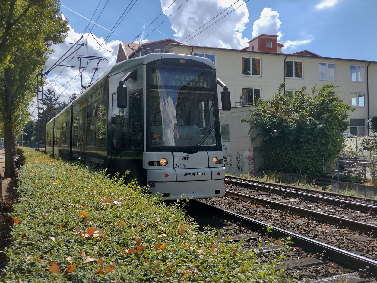 Gestern war ich entlang einer der schönsten Straßenbahnabschnitte in Frankfurt unterwegs: Am Mainufer in Fechenheim. Dort sind mir zwei Züge der Linie 11 begegnet.