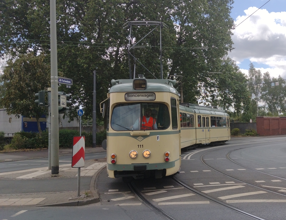 Manchmal ist es einfach Glück: Auf dem Weg nach Offenbach fuhr mir gestern an der Mainkur erst der Straßenbahnwagen 111 aus dem Museum und dann ein nagelneuer Zug der Baureihe T30 vor die Kamera meines Telefons.
