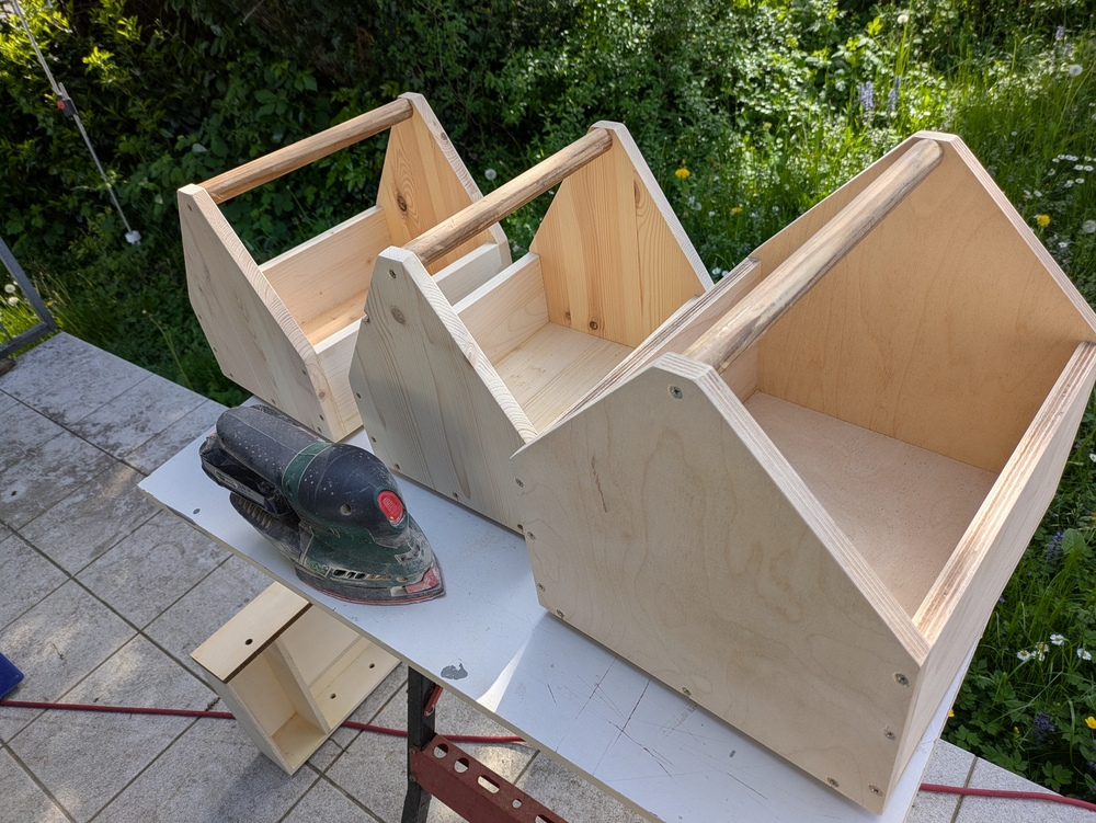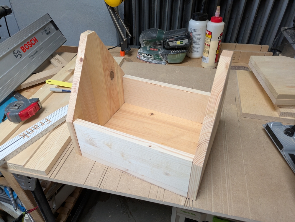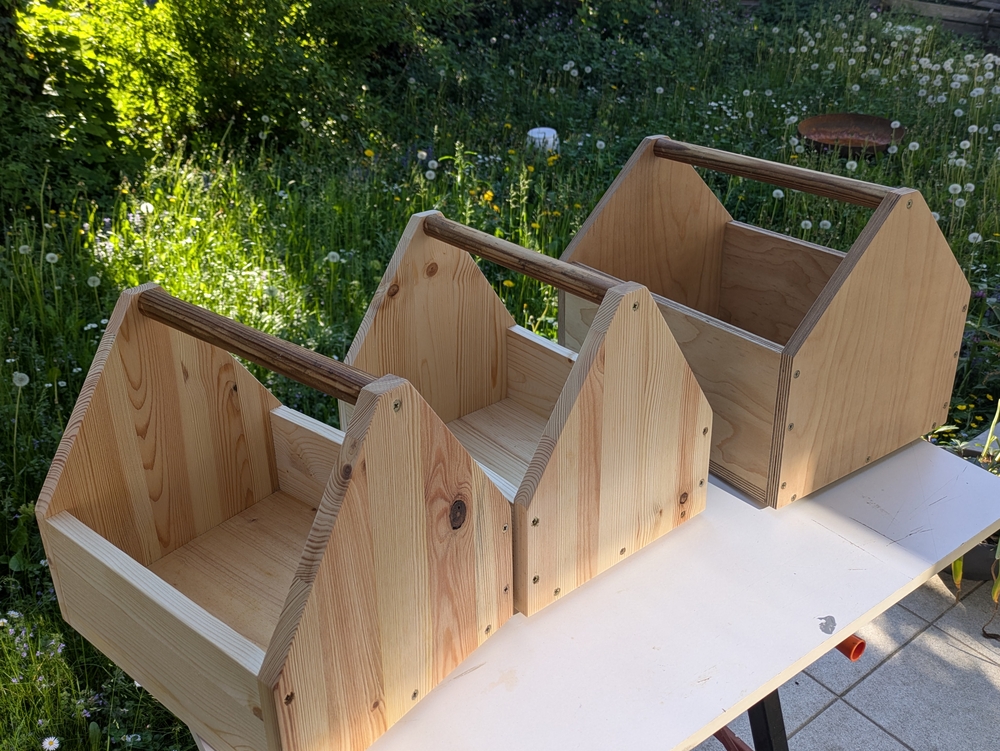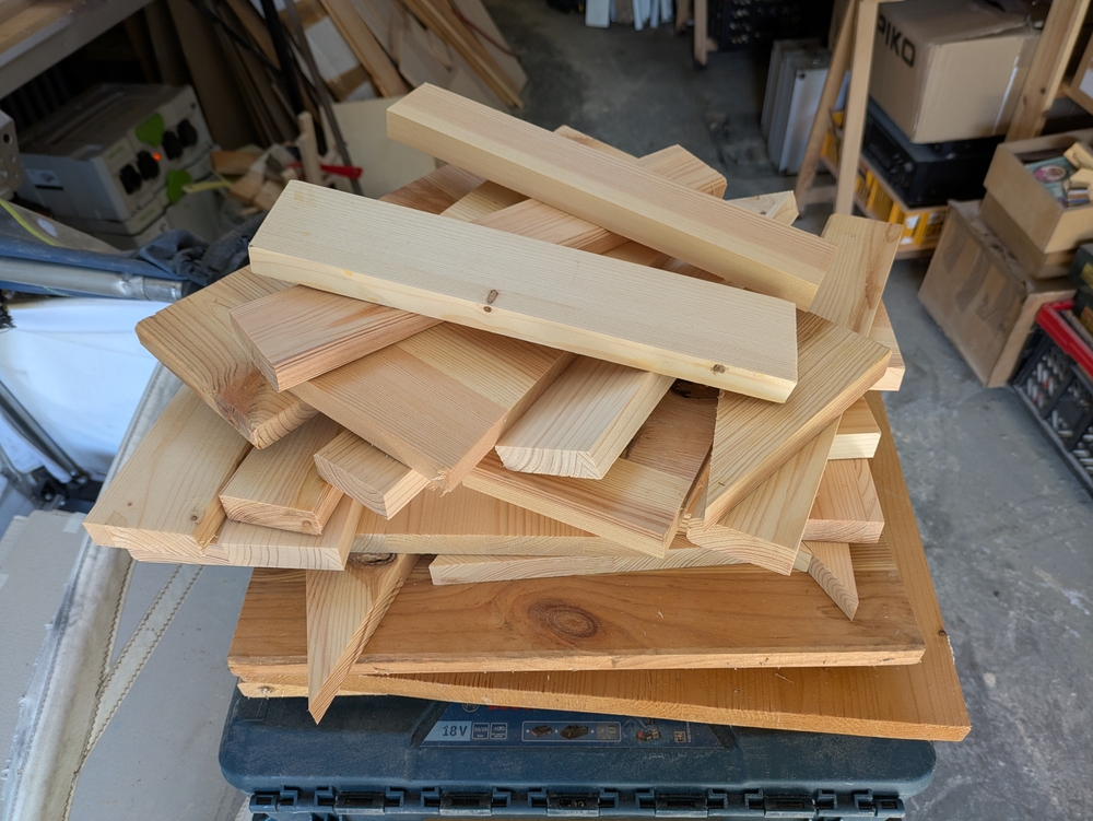 Niclas Klinner hat zum Bauen Reste von Leimholzplatten genommen. Auch bei mir in der Garage lag noch ein Haufen Leimholz herum, dass vom Möbelbauen übrig geblieben war. In der Schraubenkiste fanden sich noch passende Spax-Schrauben, deren Packung ein Preisschild trug, das einen D-Mark Preis anzeigte, und als Griff für die Kästen habe ich einen alten Besenstiel genommen. Mein Ziel war, für die Kästen kein neues Material zu kaufen.