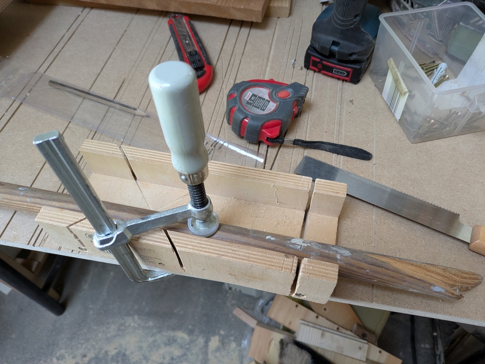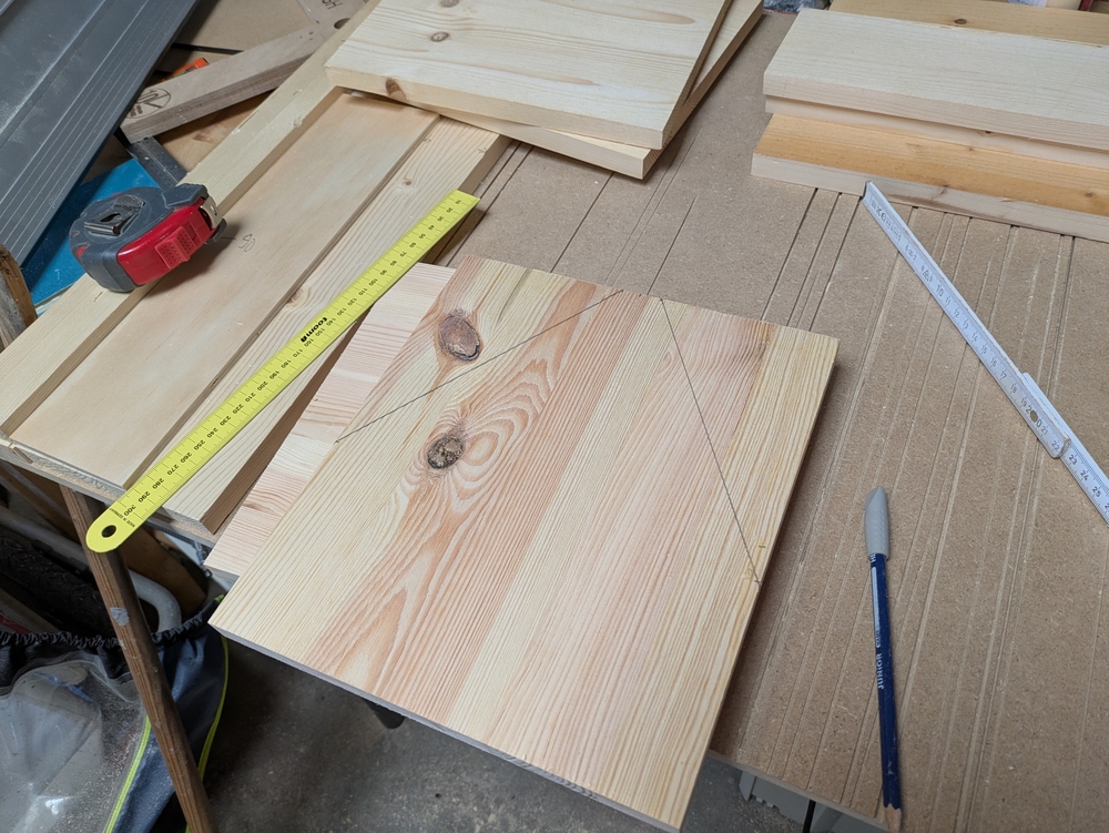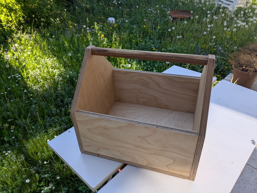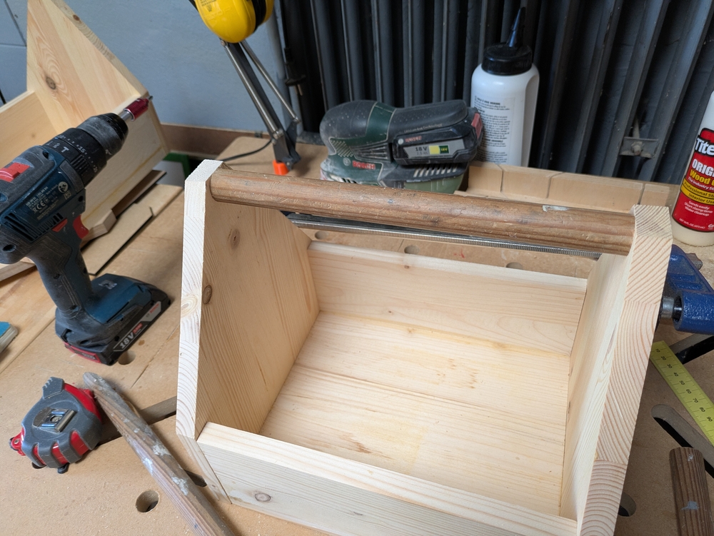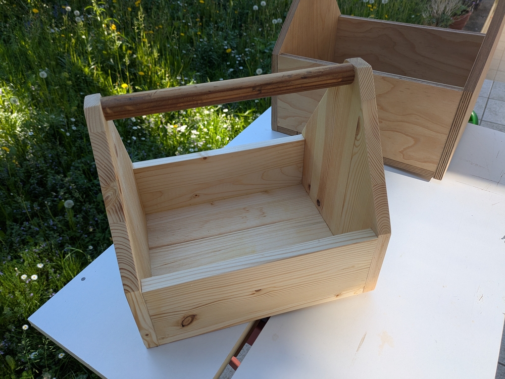Niclas Klinner hat zum Bauen Reste von Leimholzplatten genommen. Auch bei mir in der Garage lag noch ein Haufen Leimholz herum, dass vom Möbelbauen übrig geblieben war. In der Schraubenkiste fanden sich noch passende Spax-Schrauben, deren Packung ein Preisschild trug, das einen D-Mark Preis anzeigte, und als Griff für die Kästen habe ich einen alten Besenstiel genommen. Mein Ziel war, für die Kästen kein neues Material zu kaufen.