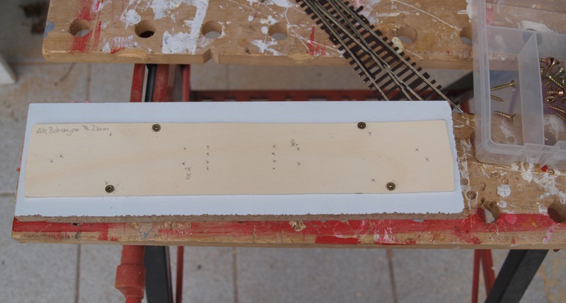 Am Anfang steht wie bei den Weichenselbstbauern das Brettchen. Ich habe mir ein passendes Stück 4mm starkes Pappelsperrholz zugesägt, das von der Höhe her genau zur Gleisunterlage im Bahnhof passt.