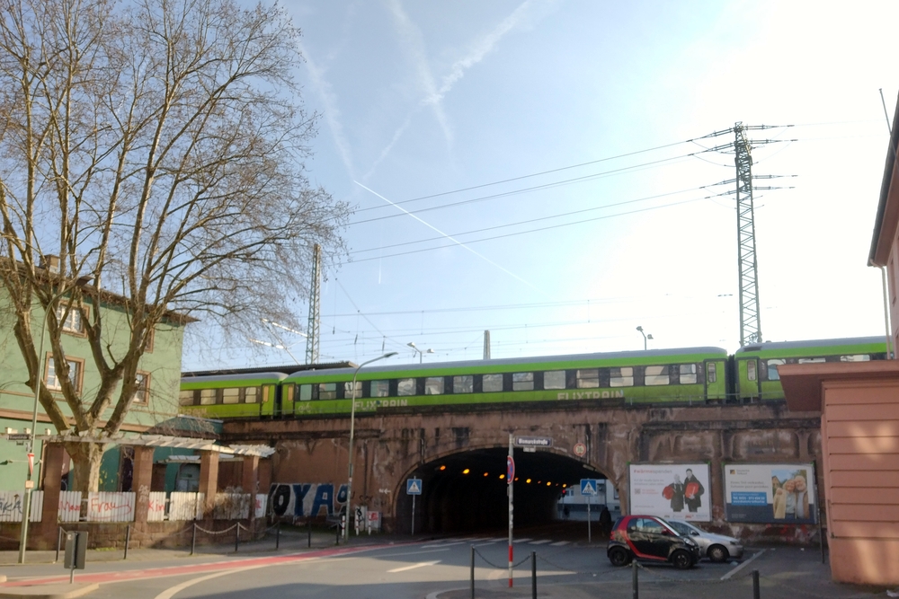 Auf meinem Weg von Frankfurt nach Offenbach stand gestern Mittag ein Flixtrain auf der Brücke über die Bismarckstraße am Offenbacher Hauptbahnhof.