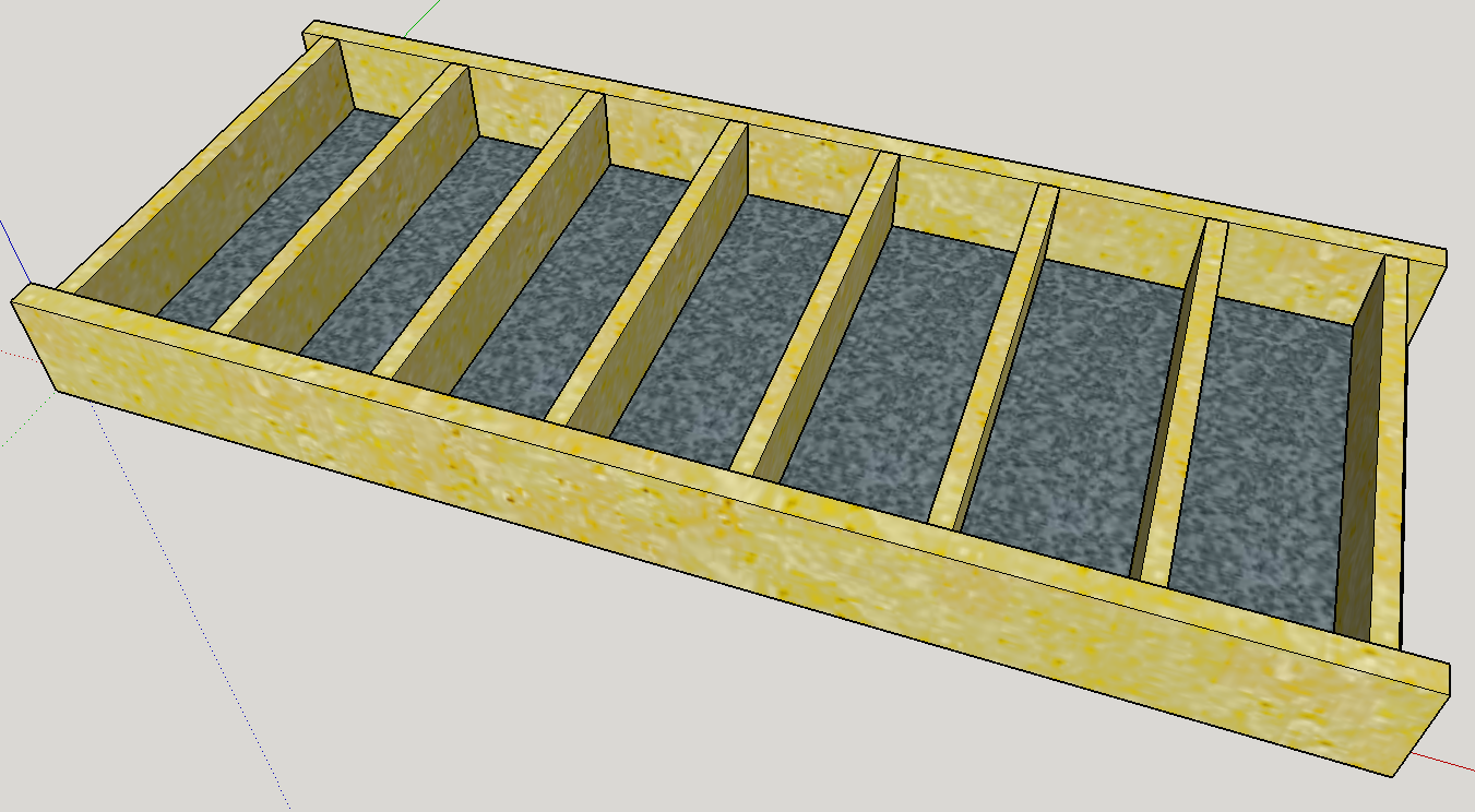 Die Fächer haben ein Innenmaß von 135x42mm und sind 30mm hoch. Der Boden des Einsatzes besteht aus 4mm starkem Sperrholz, die Trennstege sind 6mm stark die beiden langen Rahmenteile 8mm. Die Maße für die Holzteile ergaben sich aus den vorhandenen Sperrholzresten. ;-)