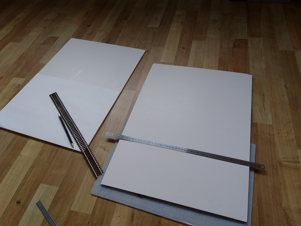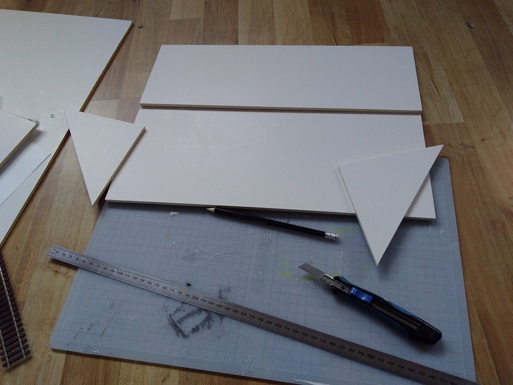 Im Fundus fanden sich noch ein paar etwa A2 große Platten Kappa in 5mm Stärke, aus denen ich die Einzelteile mit Messer und Stahllineal ausgeschnitten habe.