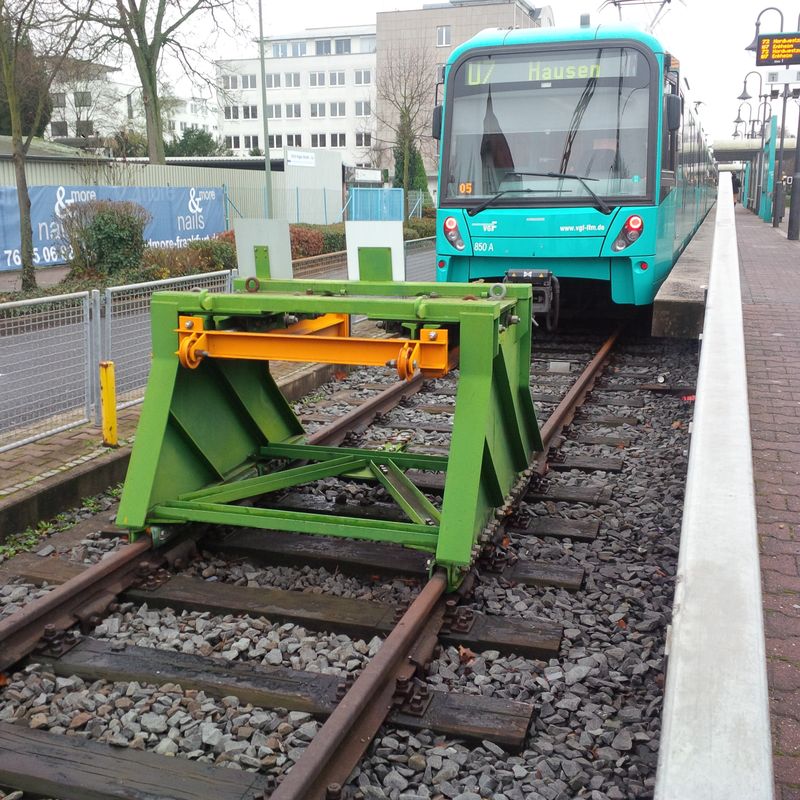 Wohl um zu verhindern, dass die Oberleitung bei einer versehentlichen Beschädigung des Mastes ebenfalls Schaden nimmt, hat die VGF die Oberleitung mit Hilfe eines Arbeitswagens gesichert.