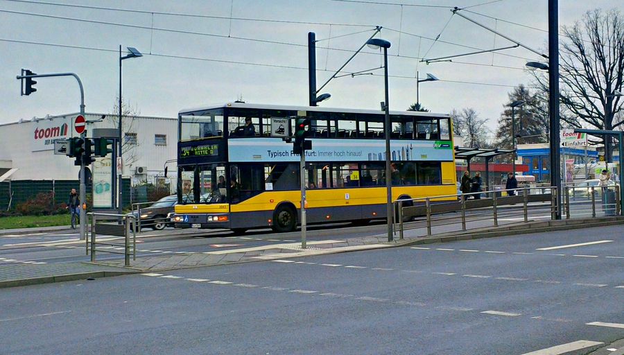 Als ich gestern die Friedberger Landstraße heraufgeradelt bin, glaubte ich an der Friedberger Warte meinen Augen nicht trauen zu können: Dort stand ein Doppeldeckerbus der BVG, allerdings mit Frankfurter Linienbezeichnung.