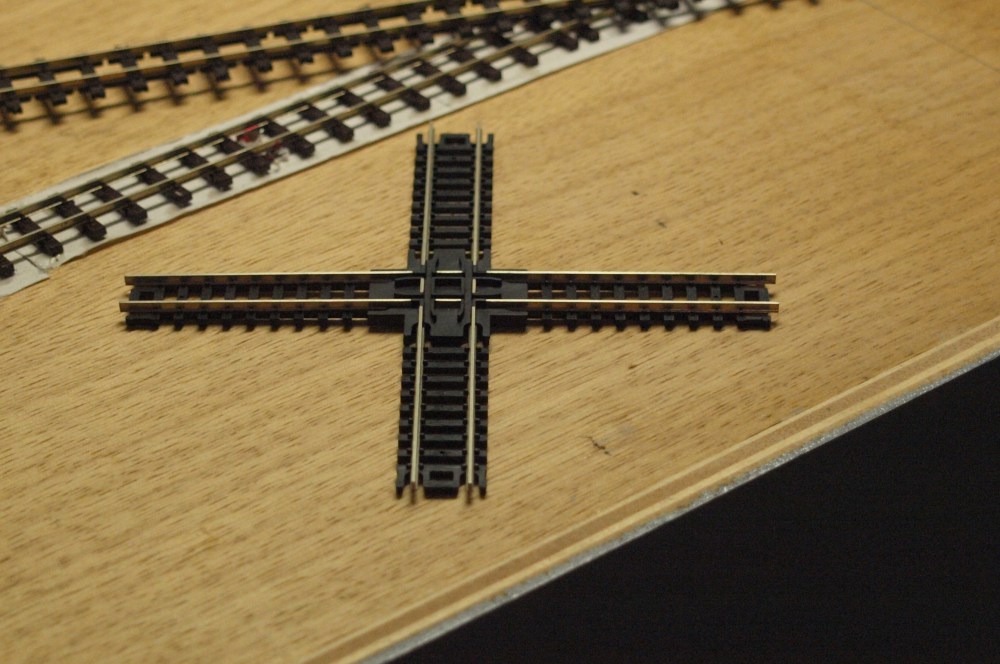 Die Schmalspurmodule sollten bis zum ersten großen Treffen des H0-Modellbahnforums fahrbereit sein. Dazu musste ich die Kreuzung der Schmalspurbahn mit der Feldbahn fertig stellen. Ursprünglich hatte ich geplant, die Kreuzung selbst zu bauen. Der erste Prototyp hat mich allerdings nicht so recht überzeugt, so dass ich mir eine 90° Kreuzung von Atlas mit Code 80-Gleisen in der Baugröße N besorgt habe.