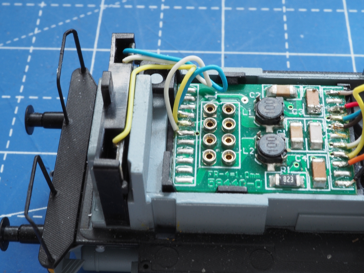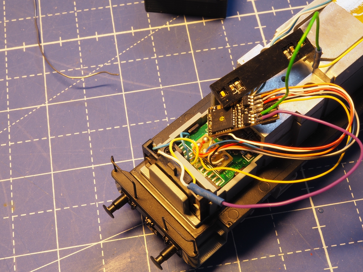 Für den Decoder gibt es ein Fach im langen Vorbau. Das Fach ist groß genug für einen Sounddecoder, ich habe mich aber dafür entschieden, einen Fahrdecoder zu verbauen, weil nicht jede meiner Loks mit einen Sounddecoder ausstatten will. Die Wahl fiel auf einen Zimo MX623, den es auch mit einem achtpoligen Schnittstellenstecker gibt und der auf der Platine noch Lötpads für die nötigen verstärkten Funktionsausgänge F1 und F2 hat.