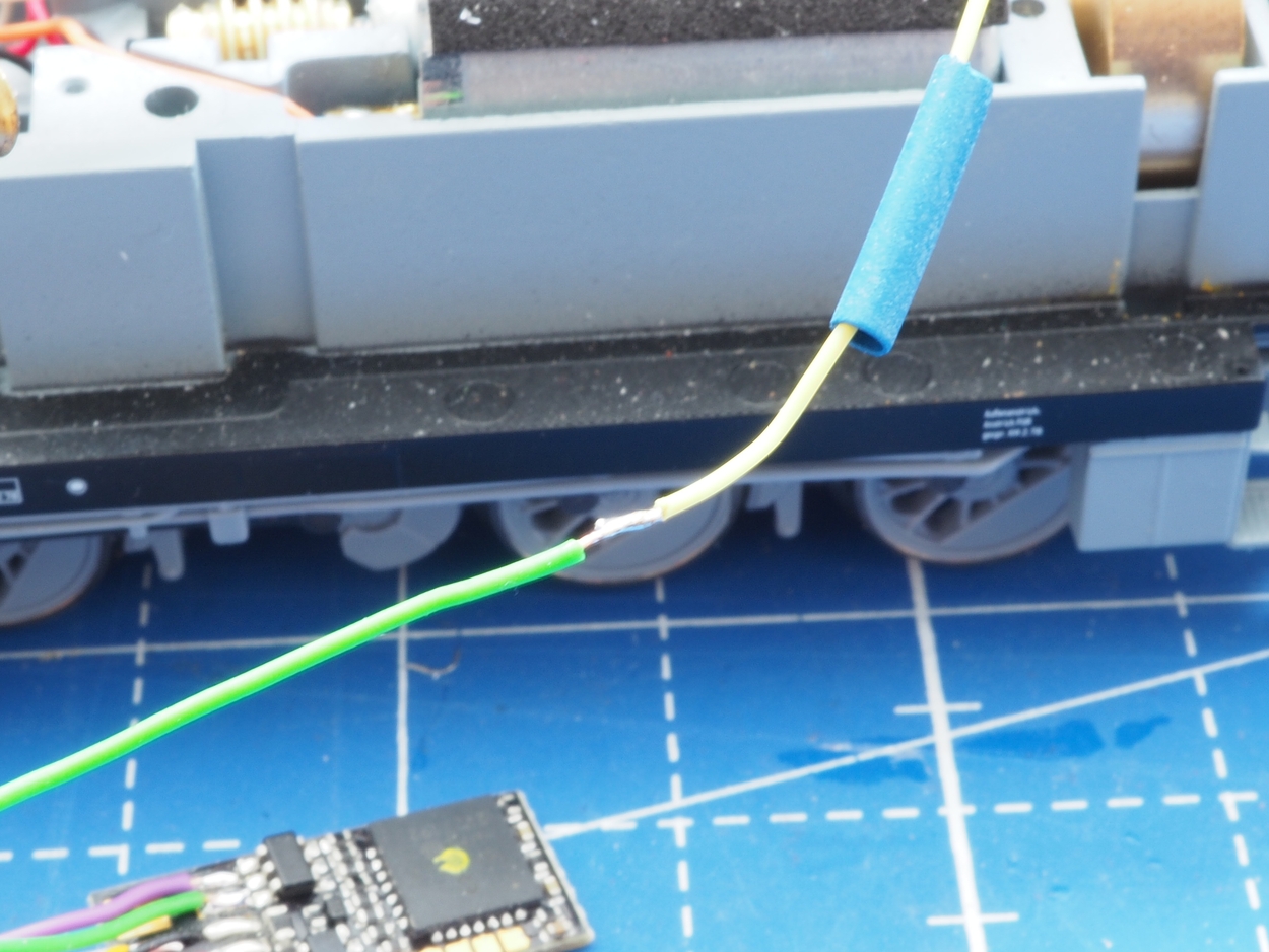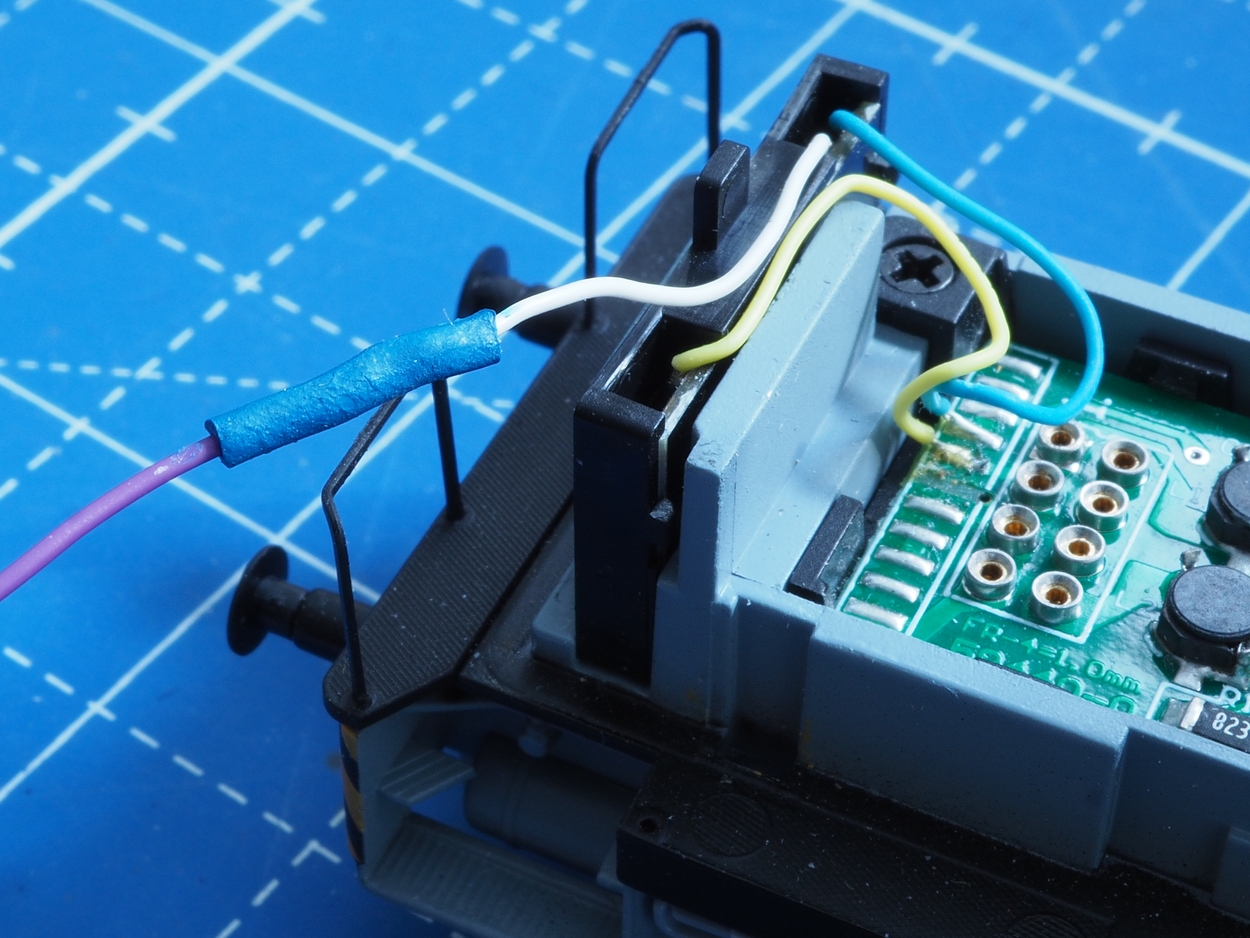 Auf der Platine des Decoders habe ich an das Lötpad für F1 eine grüne, an das Lötpad für F2 eine violette Decoderlitze angelötet und mit dem Zugschluss für hinten (weiß) und vorne (gelb) verbunden.