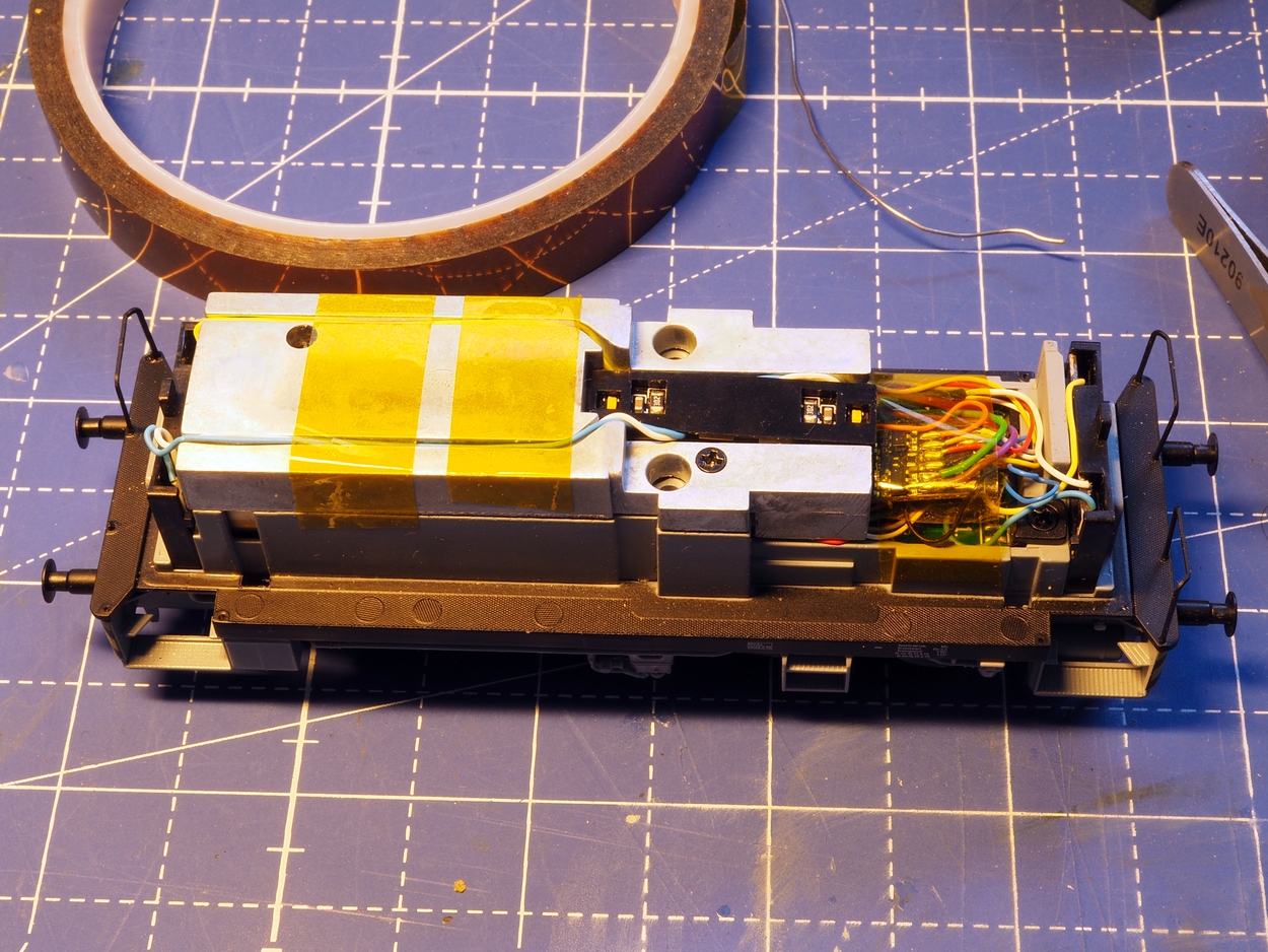 Das wars im Grunde schon. Jetzt galt es noch die ganze Kabelage halbwegs ordentlich in der Lok zu verstauen - das ist mir halbwegs gelungen, ich habe zusätzlich die Kabel und den Decoder noch mit Kapton-Tape gesichert, damit nicht ein Kabel irgendwo eingequetscht wird oder zwischen Schnecke und Getriebe gerät.