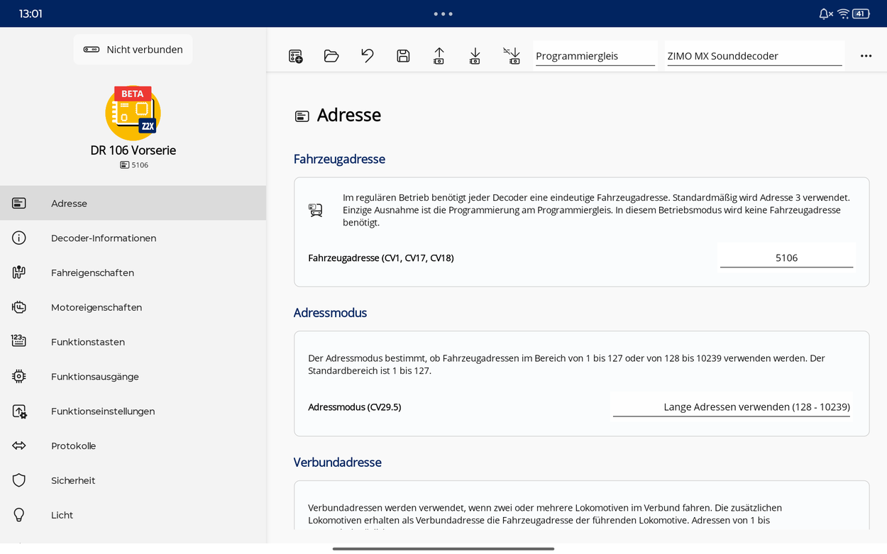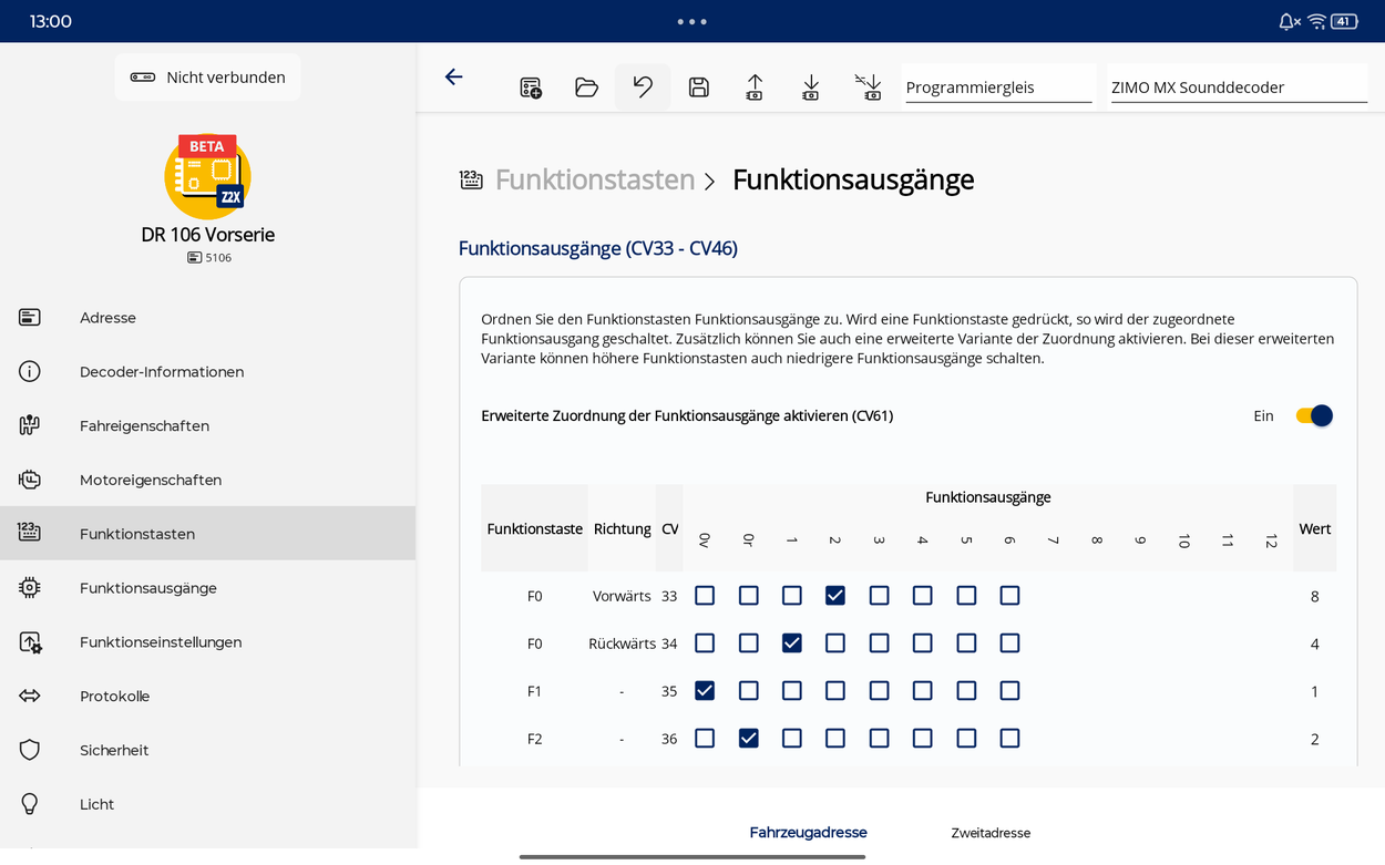Ich habe dazu die Android-App Z2X verwendet, die zusammen mit einer Z(z)21 von Fleischmann/Roco ein übersichtliches Einstellen des Zimo-Decoders ermöglicht.